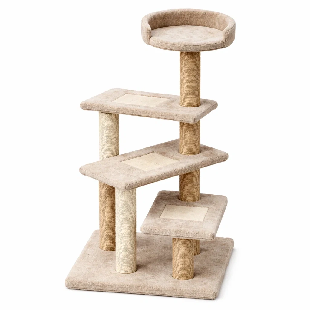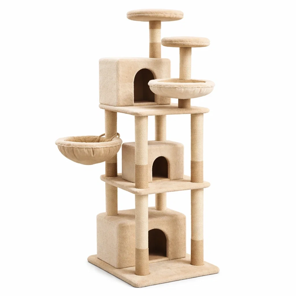 Arbre à chat en peluche beige avec plateformes et maisons