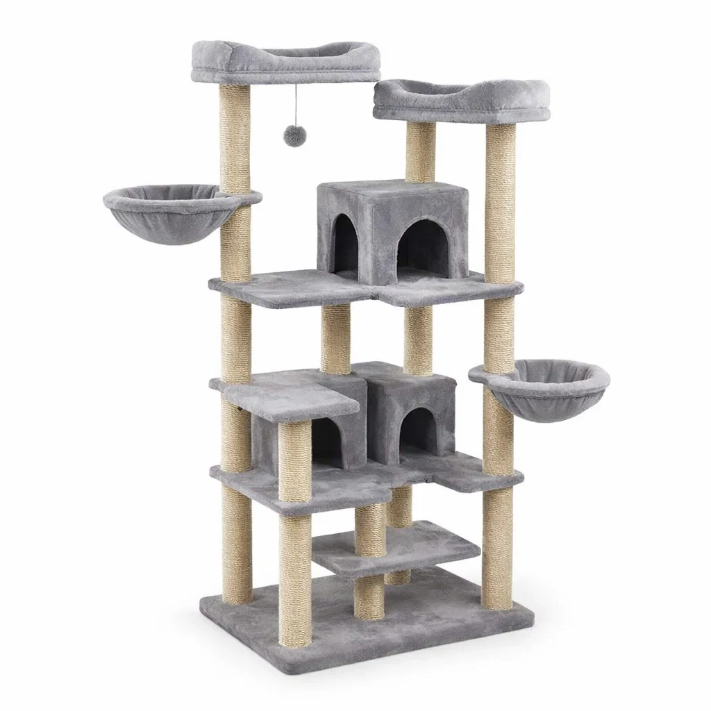 Arbre à chat en bois et sisal avec plateformes et hamac gris