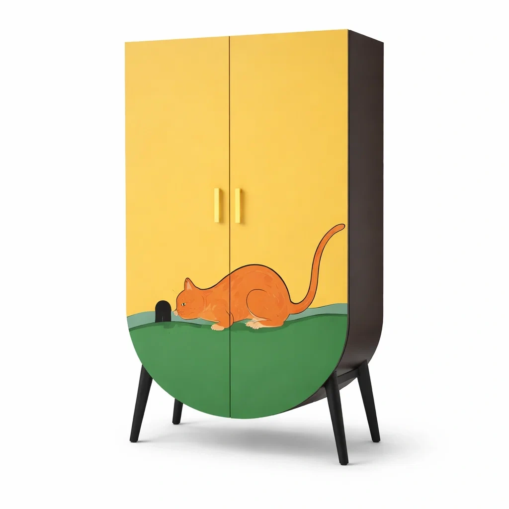 Armoire enfant en bois avec motif chat jaune et vert 120x60x200 cm