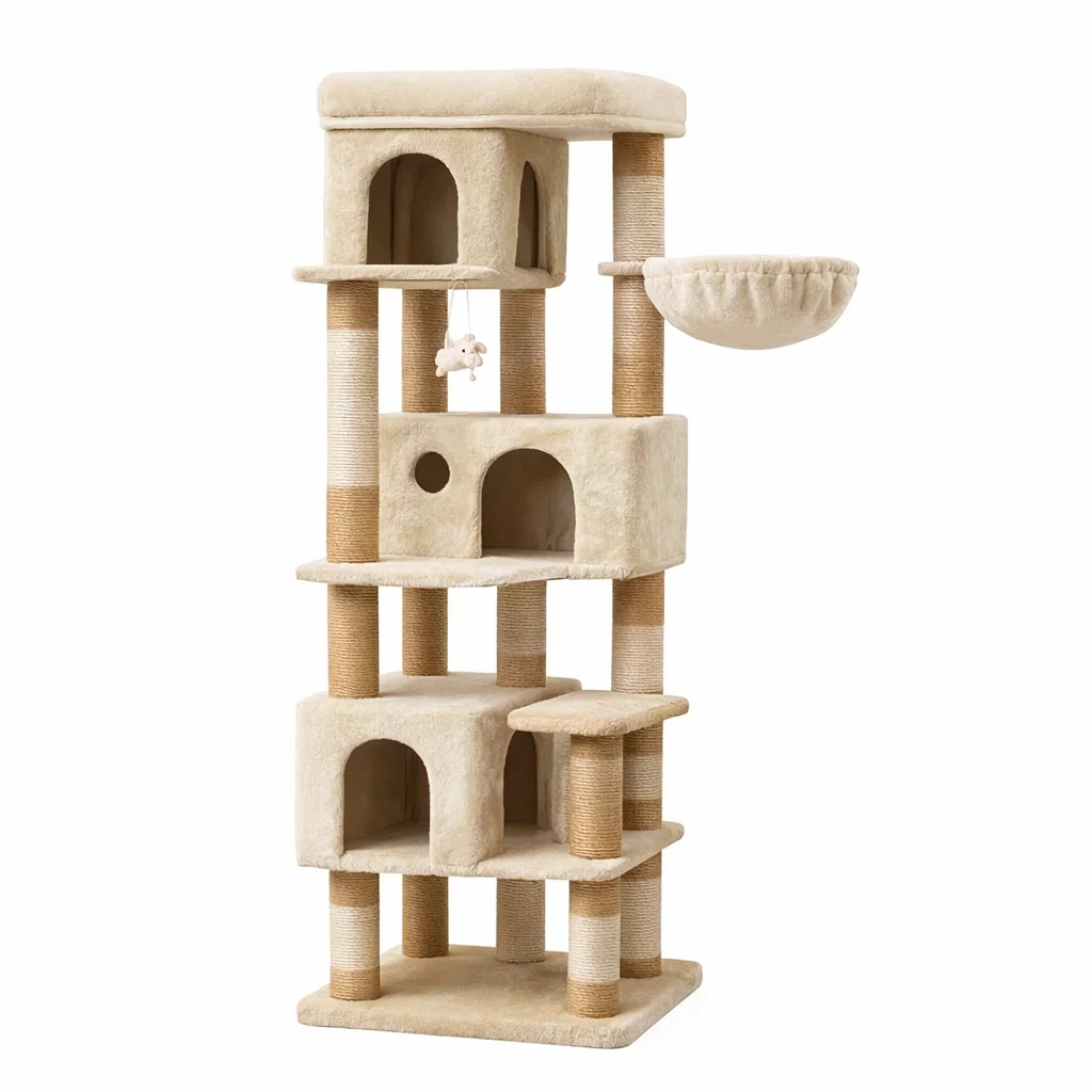 Arbre à chat en bois et peluche beige