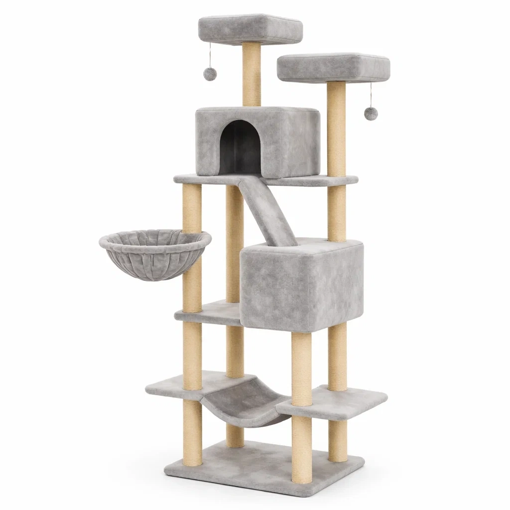 Arbre à chat en bois et sisal avec plateformes et hamac gris