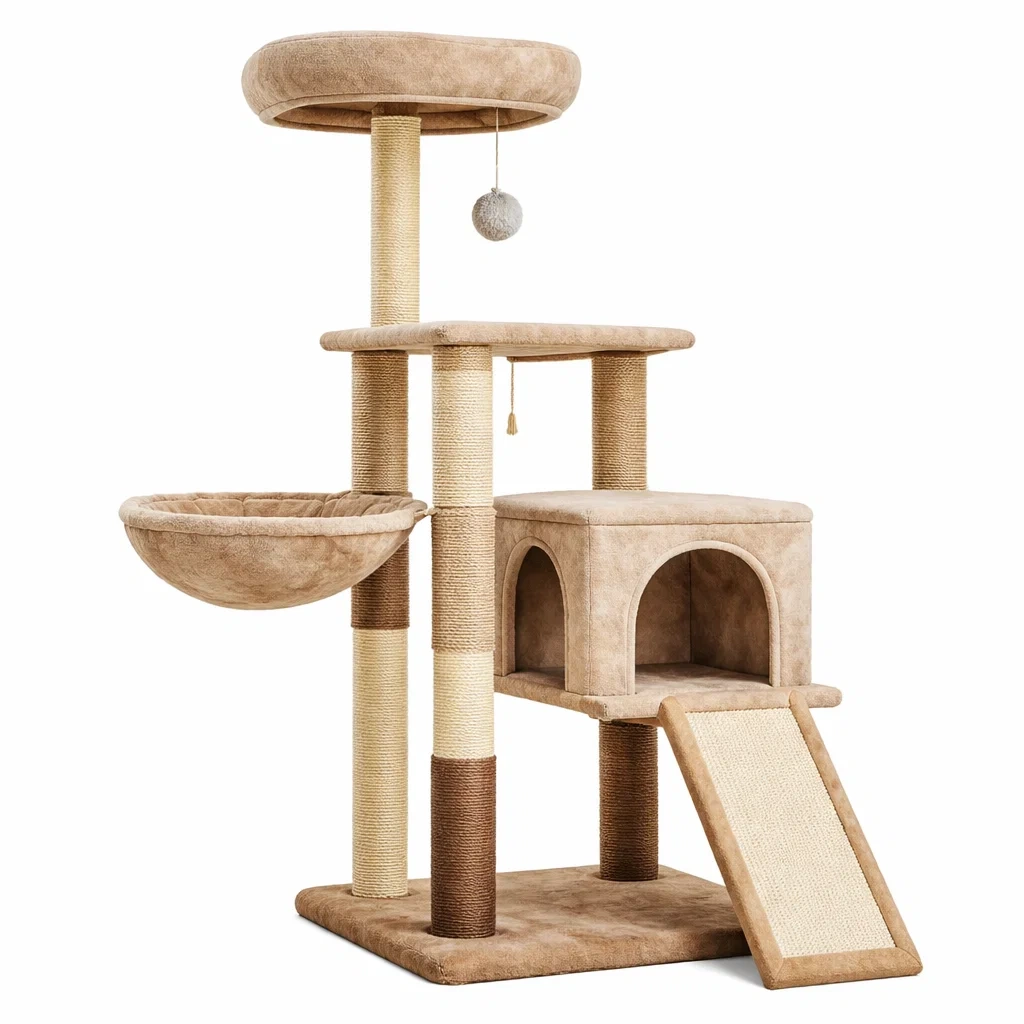 Composants : Un nid, une plateforme, un jouet suspendu, un grattoir en sisal